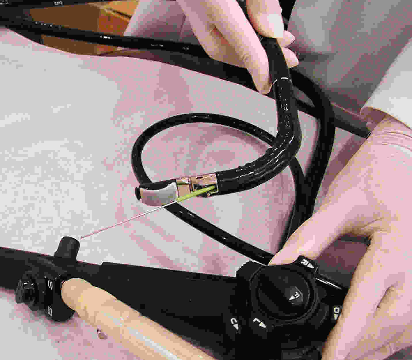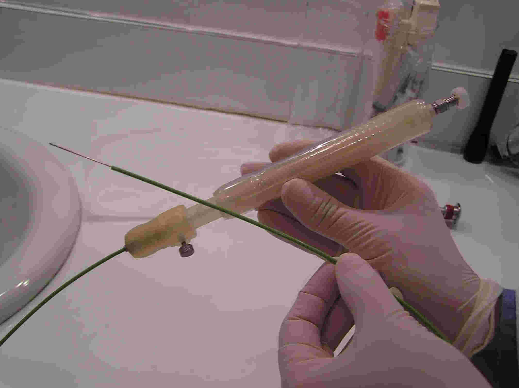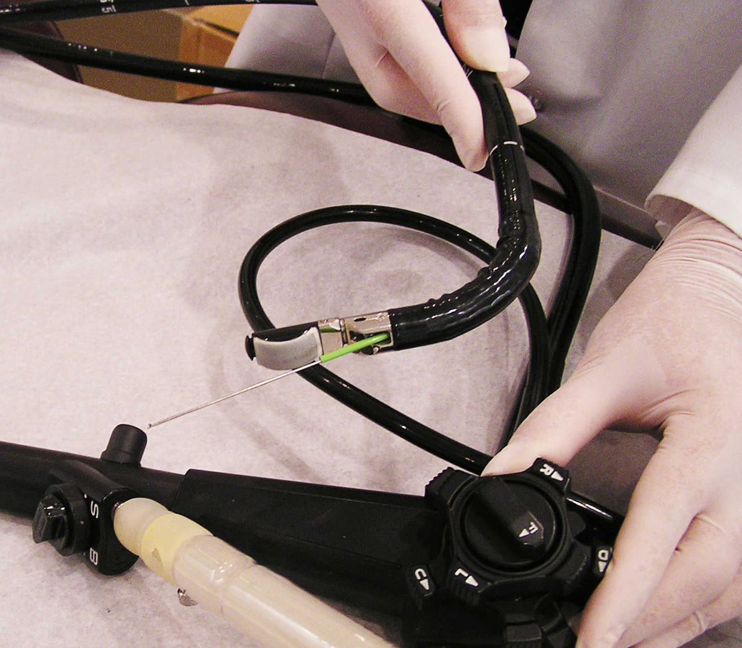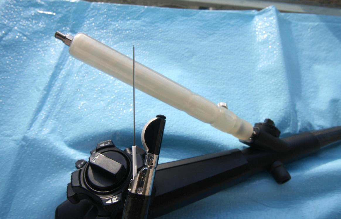 Cells obtained through EUS FNA from an islet cell tumor of the pancreas Another drawback to the currently used EUS FNA needle is that it is made of stainless steel. As the needle passes through a retroflexed EUS endoscope, it becomes misshapen. A bent needle is difficult to aim correctly at a tumor, especially under ultrasound guidance. Consequently, sometimes two devices are used during a single procedure, rendering it excessively costly. The Nakao R-FNB needle is advanced to the lesion under ultrasound guidance. While the needle is plunged into the suspected tumor, the specially designed handle brings about a rotation of twice 360 degrees transmitted in a 1:1 fashion from the handle to the needle. As a result, the needle rotates as it advances into the target tissue, obtaining a core biopsy with every single needle pass. The major advantage achieved by The Nakao R-FNB is the core tissue biopsy obtained with this device. This core biopsy enables immune staining, hormonal tumor sensitivity, assessment of tumor margins, and various tissue staining techniques that far outshine an analysis of singular cells of a histology smear. This core tissue biopsy is achieved with every single needle pass. Owing to its shape memory Nitinol needle, The Nakao R-FNB is guaranteed to maintain a straight configuration throughout the entire procedure. Shown above is The Nakao R-FNB passed through a 90 degree retroflexed (U-turned) EUS endoscope. The Nakao R-FNB passed through a retroflexed EUS endoscope Market: The existing market for EUS-FNA flexible device market is dominated by Cook Medical, Boston Scientific, and Olympus Corporation. Pricing ranges from $200 to $300 per disposable device. Data on the number of EUS-FNA devices sold in the US, Europe, Japan, and the rest of the world (ROW) was obtained by the Millennium Group: