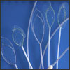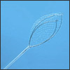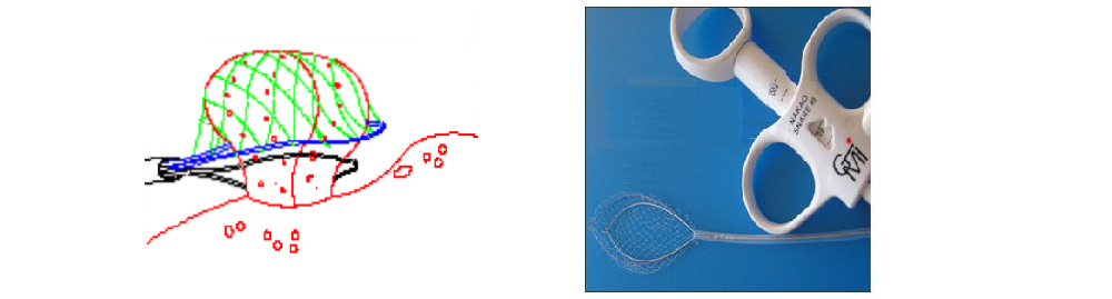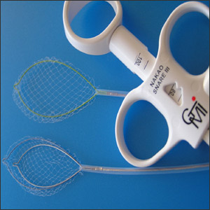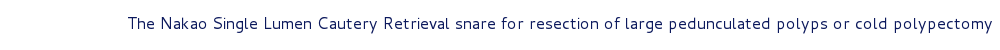 The SpiderNet is a retrieval net utilizing a delicately handmade pouch specially tethered to the inner wall of the catheter to enable its sliding up and down the snare for proper positioning around the polypoid specimen. See the tether below: it is a blue line inside the catheter enabling the net to slide up and down the snare so that the delicate specimen is not mined. II. The Nakao Cautery Retrieval Snare (SNET) is a double lumen snare that houses a regular cautery snare in one lumen, and the retrieval basket in another. The specially designed and patented handle enables the cautery snare to first be ejected to resect the polyp in the usual fashion. After the polyp is severed, without having to remove the catheter from the working channel of the endoscope, the retrieval net is ejected to retrieve the specimen. The fine retrieval net cradles the delicate specimen so that it may be safely delivered to the pathologist.